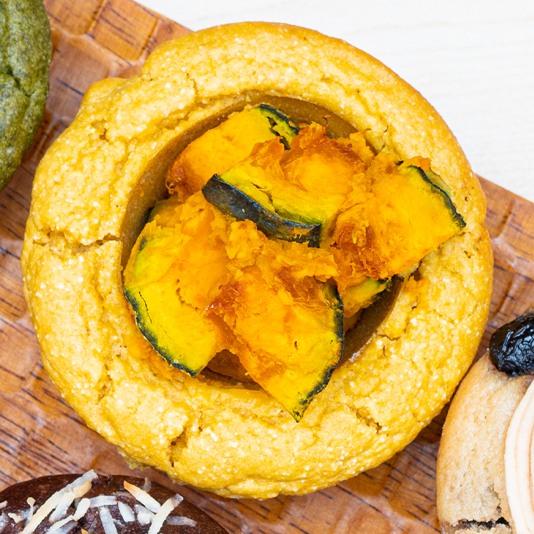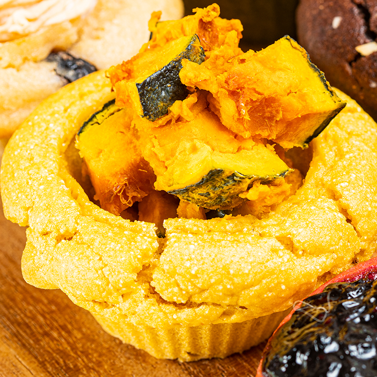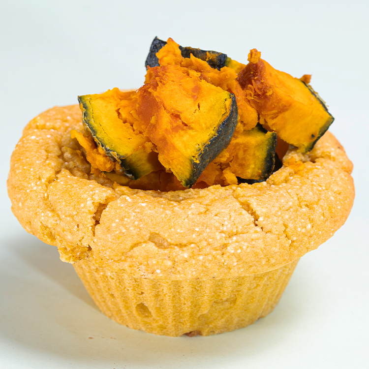 北海道恵庭産のカボチャを27大アレルゲンフリーのマフィンの生地にたっぷりと練り込み、カボチャペーストの上にさらにカボチャをそのまま大盛りでトッピングしました。道産カボチャのおいしさを丸ごと楽しめるマフィンです。また、トウモロコシなど季節の旬野菜のそのまま山盛りマフィンも登場します。